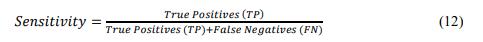 The sensitivity of a model is defined as the proportion of real positive cases that are correctly detected. It is also called the True Positive Rate (TPR) or Recall. This is very important in applications like medical diagnostics, where false negatives can have costly consequences. This can be obtained from the equation 12.