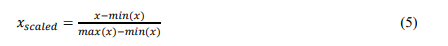 The Min-Max Scaling method typically enhances characteristics to a fixed range [0, 1]. The scaled value of a feature π₯ is given in equation 5. πππ(π₯) and πππ₯(π₯) are the minimum and maximum values of the feature π₯ across the entire dataset.