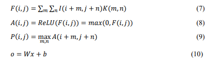 where πΌ(π,π) corresponds to the value entered at location (π,π), πΎ(π, π) locates the filter at the (π, π), and πΉ(π,π) stands as the feature of output at the location (π,π). The filter πΎ is typically small (e.g., 3Γ3 or 5Γ5) still moves across all the input matrices πΌ to detect local patterns. π(π,π) is the feature that was pooled at location (π,π), and π΄(π + π,π + π) represents the values within the pooling window. π is the weight matrix, π is the bias term, π₯ is the flattened feature vector, π is the final feature representation.