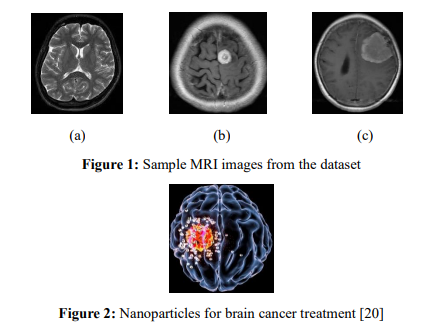 The use of multi-layer neural networks in deep learning (DL) has shown promise in areas such as statistical forecasting, image identification, and natural language processing, and it has the potential to revolutionize cancer detection and prevention [7]. According to various research, deep learning algorithms can outperform human specialists in many disease recognition scenarios. Deep learning techniques for automated pathology, confocal laser endomicroscopy (CLE), and fluorescence image processing in diagnosing oral cancer have also shown promising results [8]. Among the many types of deep neural networks, CNNs stand out for their ability to solve computer vision problemsβsuch as recognition and classification tasksβand sometimes even outperform human specialists [9]. An example of a Deep Learning technique is a CNN. It can distinguish between objects in an image by learning their relative sizes and using these values as weights and biases [10]. Despite the potential of nanosensors and AI, their widespread application in early cancer detection faces challenges such as limited annotated datasets due to the nascent state of nanosensor technology. Nanosensors produce complex, high-dimensional data requiring advanced computational methods for analysis. Realtime processing demands must be met while maintaining high sensitivity and scalability [11]. Figure 1 (a) shows the healthy brain MRI image, and Figures 1 (b) and (c) are the cancerdetected MRI images.