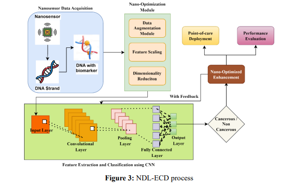 NDL-ECD is a deep-learning framework for early cancer detection using nanosensor technology. It exploits a lightweight CNN to process biomarker data from nanosensors, identifying highly sensitive cancerous traits. The framework addresses challenges in limited data, high dimensionality, and real-time processing through an integrated nano-optimization module, which performs data augmentation, feature scaling, and architecture optimization. Validated with both synthetic and real-world datasets, NDL-ECD achieves a 25% increase in sensitivity while having a 20% decrease in false positives. Being lightweight, it assures realtime performance and is thus applicable in point-of-care applications and large-scale screening. The steps of the NDL-ECD approach are illustrated in Figure 3.