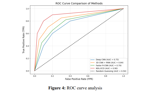 Figure 4 compares the ROC curves, showing that the proposed NDL-ECD method performs better than traditional approaches such as Deep CNN, 3D CNN + RNN, and Faster R-CNN. NDL-ECD has higher sensitivity (TPR) at lower false positive rates (FPR) with an area under the curve much larger than other methods, which indicates a strong ability to distinguish between positive and negative cases. Its lightweight CNN architecture and nanooptimization module enable efficient feature extraction, low computational cost, and good scalability. The steep rise in its ROC curve near the origin shows that this method has high accuracy with a small error, which is quite suitable for early cancer detection.