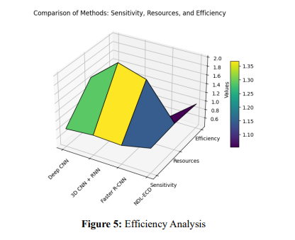 Figure 5 illustrates the superiority of the proposed NDL-ECD framework over traditional approaches like Deep CNN, 3D CNN + RNN, and Faster R-CNN. NDL-ECD achieves the highest sensitivity of 96% using the least computational resources due to its lightweight architecture and the nano-optimization module. Traditional approaches, while having reasonable sensitivities of about 80-85%, require more computational resources to compromise their efficiency. This gain in efficiency in NDL-ECD is credited to real-time processing capabilities, feature scaling, and architectural optimizations in depthwise separable convolutions. The proposed framework reduces false positives while ensuring scalability; hence, it is suitable for early cancer detection and large-scale applications.