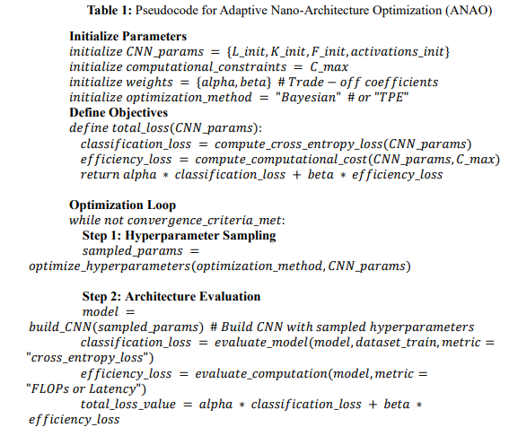 The pseudocode for Adaptive Nano-Architecture Optimization (ANAO) undergoes an iterative process for optimizing a CNN for efficient and accurate classification of nanosensor data. It first initializes CNN parameters and computational constraints, defining a total loss function that combines the classification accuracy with efficiency metrics. Using Bayesian Optimization or TPE, the algorithm samples hyperparameters to build and evaluate CNN models. Lightweight operations, including depthwise separable convolution and activation quantization, are adopted if the constraints are exceeded in real-time processing. Latency testing on batches evaluates scalability, and a better-performing model is iteratively updated to ensure high diagnostic accuracy while meeting computational and scalability requirements.