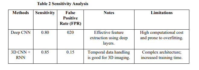 Wankhade, S., & Vigneshwari, S. [17] proposed a framework called Cancer Cell Detection and Classification using Hybrid Neural Network (CCDC-HNN), combined 3D-CNN with Recurrent Neural Network (RNN) for the early-stage lung cancer diagnosis through computed tomography (CT) images. The model was constructed to circumvent the limitations of conventional diagnostic procedures and, most importantly, to provide better accuracy in discriminating between benign and malignant tumours. The model showed a 95% accuracy, outperforming the existing methodologies due to better feature extraction and classification capabilities. Limitations included requiring large computational resources, difficulty reducing false positives, and dependence on high-quality data sets.
