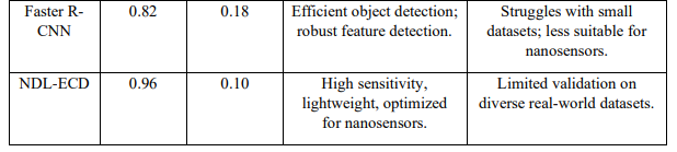 This section compares the proposed NDL-ECD framework to conventional methods, such as Deep CNN [11], 3D CNN + RNN [17], and Faster R-CNN [13], regarding accuracy, sensitivity, and efficiency. The results demonstrate that NDL-ECD outperforms these methods in terms of diagnostic precision, with a sensitivity of 96% and a lower false positive rate (10%), compared to Deep CNN (80%), 3D CNN + RNN (85%), and Faster R-CNN (82%). The NDLECD's lightweight architecture guarantees high computational efficiency while keeping resource consumption low and preserving real-time processing capabilities. Conventional methods, on the other hand, require larger computational resources and have limitations like overfitting, longer training times, and reduced adaptability to the nanosensor dataβfeatures that NDL-ECD has improved upon.